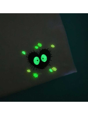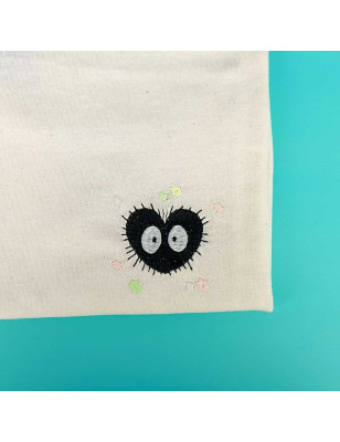 La broderie côté cœur représente une adorable susuwatari en forme de cœur, entourée d’étoiles pastel scintillantes. Les yeux et les petites étoiles sont brodés avec du fil phosphorescent : ils absorbent la lumière le jour et brillent la nuit. 🌙💫