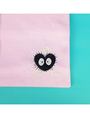 La broderie côté cœur représente une adorable susuwatari en forme de cœur, entourée d’étoiles pastel scintillantes. Les yeux et les petites étoiles sont brodés avec du fil phosphorescent : ils absorbent la lumière le jour et brillent la nuit. 🌙💫