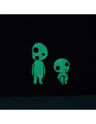 La broderie, délicate et unique, représente deux kodamas, les esprits mystérieux des forêts. En plus, ils sont brodés avec du fil phosphorescent : leurs silhouettes s’illuminent doucement dans l’obscurité 🌙, comme une petite magie à emporter partout.